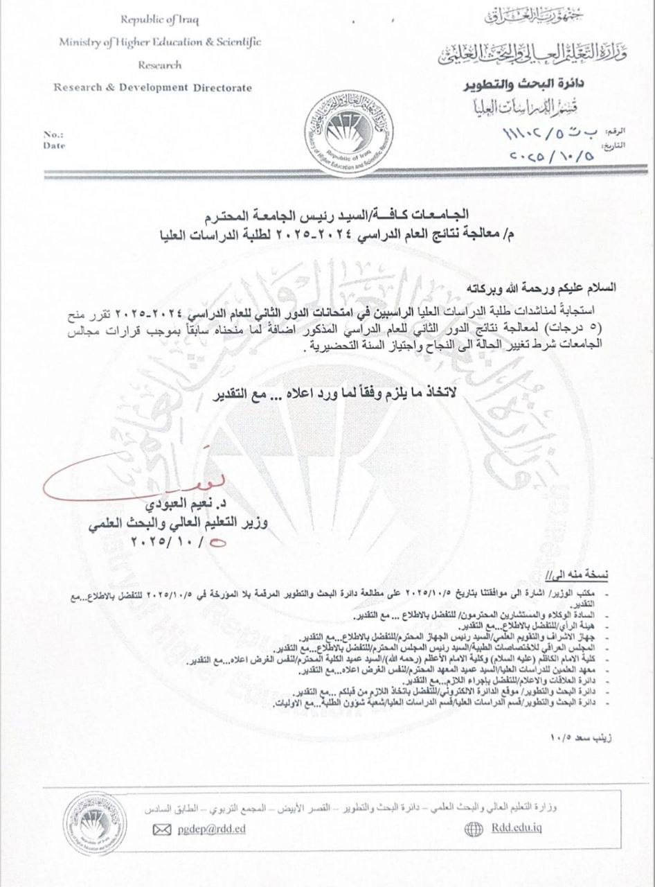 قررت وزارة التعليم العالي والبحث العلمي، اليوم الأحد، منح خمس درجات إضافية لطلبة الدراسات العليا الراسبين في الدور الثاني.