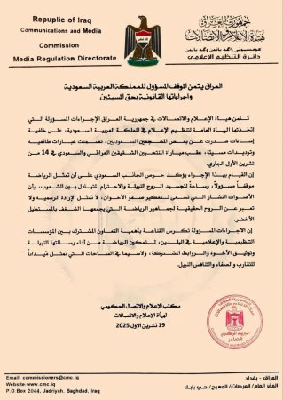 ثمنت هيئة الإعلام والاتصالات العراقية، اليوم الأحد، نظيرتها السعودية على إجراءاتها بحق بعض مشجعيها المسيئين.